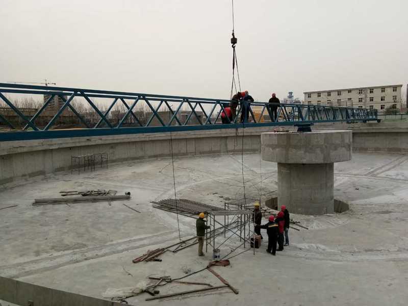 吸泥口,輸泥槽、虹吸管、中心泥罐、中心排泥管排至污泥坑。每個吸泥管上端設有調節(jié)器,以調節(jié)各吸泥管的流量分配。同時,液面上的浮渣向隨主梁旋轉的撇渣板和周邊浮渣擋板形成的漸縮區(qū)域內集中,直至其封閉邊—刮渣擺臂。由擺臂上的刮渣板刮集至集渣斗排出池外。