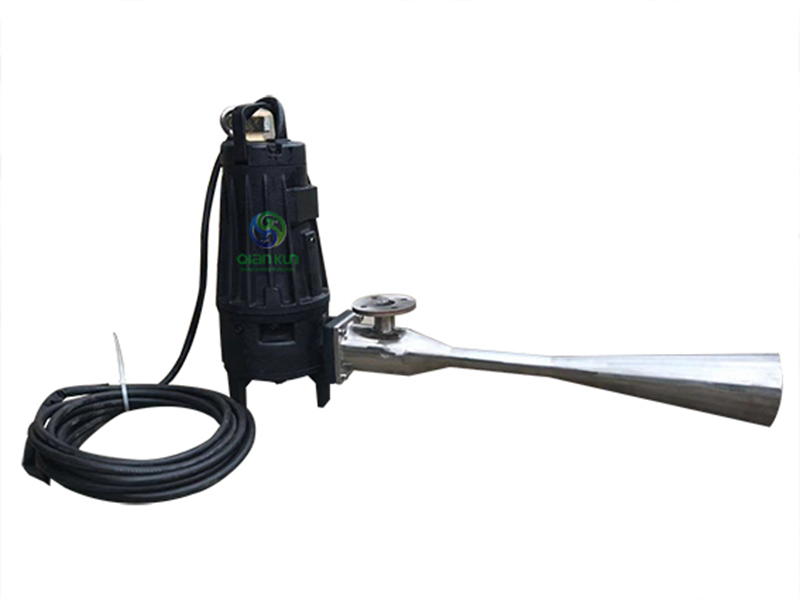 潛水泵工作后產(chǎn)生的水流經(jīng)過噴嘴后形成高速水流,在混合室內(nèi)由于噴嘴周圍形成負(fù)壓而吸入空氣,空氣經(jīng)喉管與高速水流相遇,被撕碎成微氣泡與水形成氣水混合液,高速噴射而出,夾帶大量氣泡的水流在交大的范圍內(nèi)產(chǎn)生強(qiáng)有力的單向液流,從而具曝氣、攪拌、推流一體,對(duì)推流生化反應(yīng)池更為適用,同時(shí)在曝氣過程中,氣軸功率的隨潛沒深度的變化而變化,可以在水位變化較大的池中運(yùn)用。